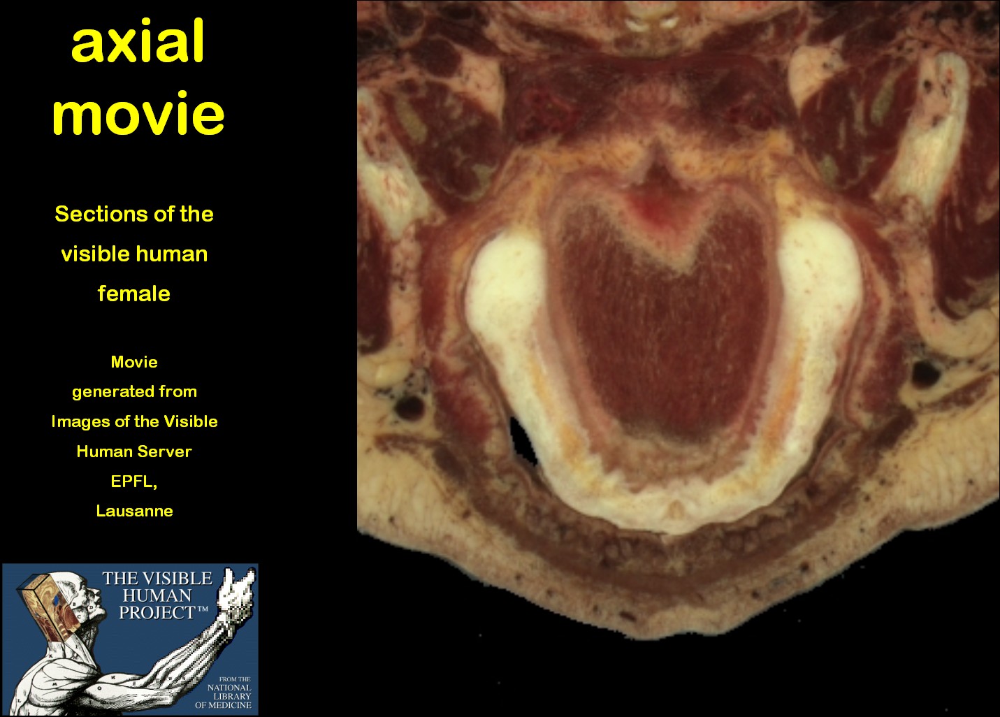 The vh female dataset with its sections cut at a distance of 0.33 mm is ideal for generation of motion pictures of original (axial) and computed (frontal/sagittal) true-colour sections in a good quality. In this way a three-dimensional picture of PNS topography can be obtained. Click here to see the movie |