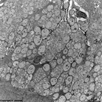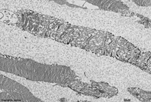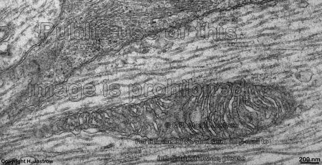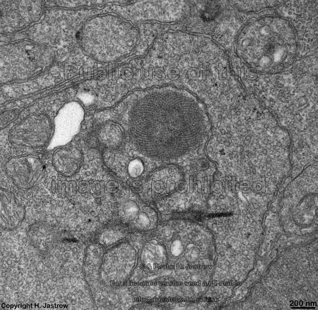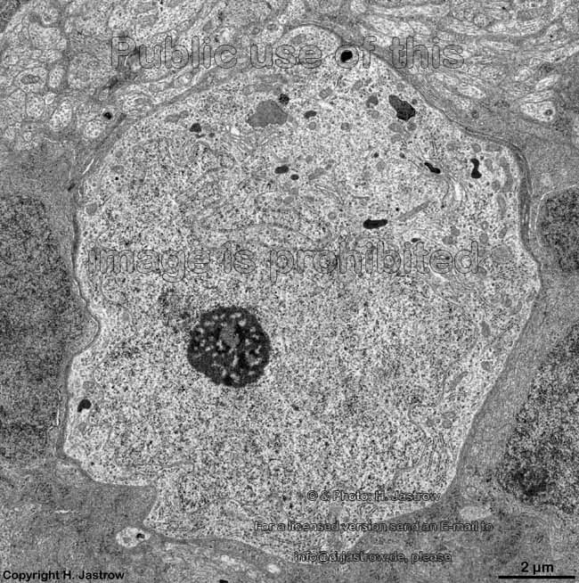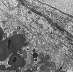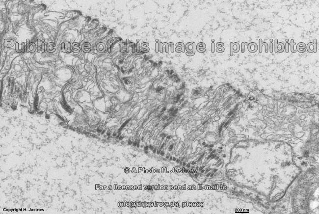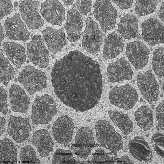 2. nerve fibre layer = Stratum neurofibrarum (--> images) virtually all non-myelinated axons which form the optic nerve at the papilla, further some blood vessels are present here 3. ganglion cell layer = Stratum ganglionicum (--> images) with multipolar ganglion cells, which are the third neurons of the visual pathway 4. inner plexiform layer = Stratum plexiforme internum (--> images) contains the synapses between the second (bipolar cells) and the third neurons (ganglion cells) of the visual pathway. Most of these synapses are ribbon synapses with synaptic bodies, further many conventional chemical and a few electrical synapses are present here. 5. inner nuclear layer = Stratum nucleare internum (--> images) with perikarya of A. bipolar cells (rod- and cone bipolar cells = second neurons of the visual pathway which can be further callsified in many fuctionally different types), B. some amacrine cells, which are located at the border to 4, C. horizontal cells, which are also less frequent and located at the border to 6. Some of the horizontal cells show very large aggregated macrotubules in their cytoplasm. D. some intermingeled nuclei of radial fibre cells, i.e. Müller's glial cells. 6. outer plexiform layer = Stratum plexiforme externum (--> images) Processes of horizontal and bipolar cells are invaginated into the terminals of the photoreceptor cells (rods and cones) that show special electron-dense cell organelles, the synaptic ribbons, close to their presynaptic membranes in this area. The resulting ribbon synapses serve for ultrafast (tonical) signal transduction to the dendrites of the second neurons of the visual pathway (rod- or cone bipolar cells). Two bizarrely formed horizontal cell processes with terminal swellings are present in one invagination of rod terminals that often is subdivided in two endings. Whereas these horizontal cell terminals are located laterally, 1 - 3 thin bipolar cell processes comprise the centre of a ribbon synapse. In contrast to that cone terminals always show 25 up to over 50 invaginations with usually two lateral horizontal cell processes around 1 - 2 short bipolar cell dendrites. Apart from the majority of ribbon synapses, conventional chemical synapses are present outside the invaginations. Electrical synapses (gap junctions) are rare in this layer. 7. outer nuclear layer = Stratum nucleare externum (--> images) with the nuclei of the photoreceptor cells (rods and cones = first neurons of the visual pathway) 8. outer limiting layer = Stratum limitans externum (--> images) area with special belt desmosomes (Zonulae adhaerentes) located between the receptor cells and the very narrow terminals of Müller's glial cells 9. layer of inner and outer segments of rods and cones = Stratum segmentorum externorum et internorum (--> images) upper part: inner- and lower part: outer segments of rods and cones. The Ellipsoid is the part of the inner segment of a photoreceptor that is closer to the outer segment. It is very rich in mitochondria, shows some root fibres, wave-like bundles of intermediate filaments and microtubules. The ellipsoid continues into the Myoid, the lower part of an inner segment which is rich in Golgi-apparatuses and RER but hardly shows any mitochondria. The inner and outer segments are surrounded by a liquor filled space into which long, thin processes of Müller's glial cells reach from outside whereas from inside other long, thin processes of pigment epithelial cells protrude. The outer and inner segments are connected to each other only via a narrow cytoplasmatic bridge containing a cilium with 9x2 + 0 microtubules. 10. pigment epithelium (Stratum pigmenti = Pars pigmentosa; --> images) with pigment epithelial cells which phagocyte the tips of the rod or cone outer segments. The incorporated parts of the outer segments condense further and finally may no longer be distinguished from nearby pigment vesicles which prevent reflection of photons from incomeing light. Vast amounts of smooth endoplasmic reticulum are characteristic for the cuboid pigment epithelial cells. The junctional complexes between these cells are rich in tight junctions and the morphological base for the blood-retina barrier. Underlying Bruch's membrane, a rather thick basement membrane with lots of elastic and collagen fibres comprises the border to the Lamina choroidocapillaris (--> images) which has lots of blood vessels. The subsequent choroidea shows pigment epithelial cells scattered in loose connective tissue with an abundance of smaller blood vessels (especially fenestrated capillaries and venoles). The outermost layer of the ocular bulb is the strong sclera which consists of thousands of very tight parallel ordered collagen fibre bundles. |
