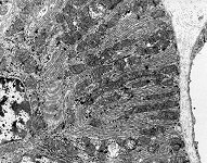 They are also connecting smooth muscle cells and are included in the intercalated discs of cardiac muscle cells. The diameter of desmosomes is 0.35 - 0.5 µm and the intercellular cleft is 25-35 nm in width in desmosome areas. --> further images and information |