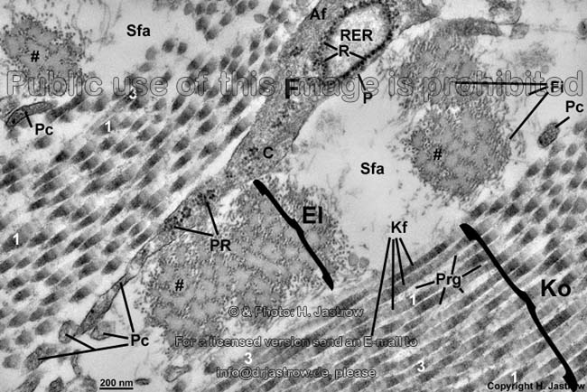 Mehrere Kollagenfibrillen (Kf; Typenunterscheidung siehe oben)