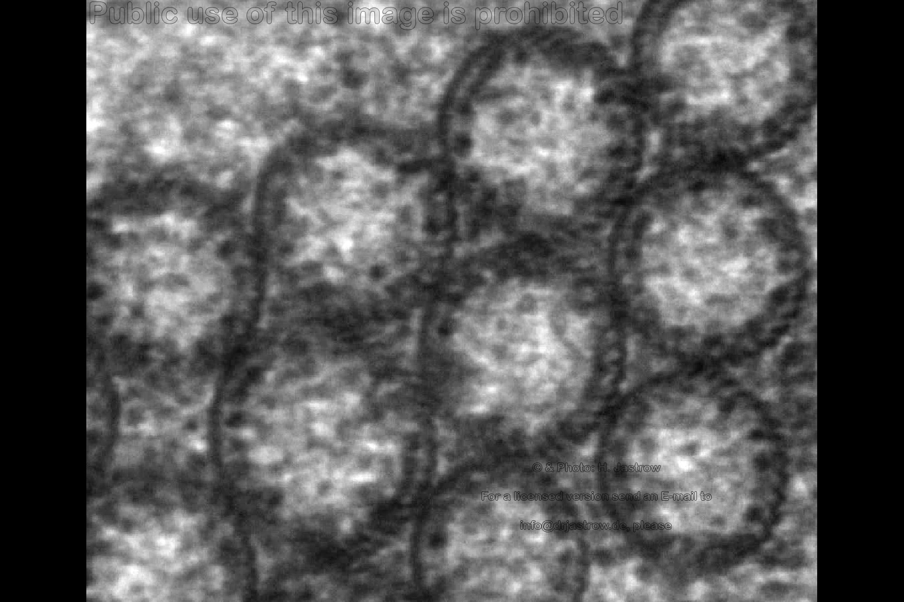 A closer look at the cross-section in Fig.8 reveals somewhat aggregated large tubes which often touch each other. They are filled with cytoplasm which sometimes contains vesicles of different electron density as you can see on the right. Now let us take a more detailed view at the area marked on the left. |