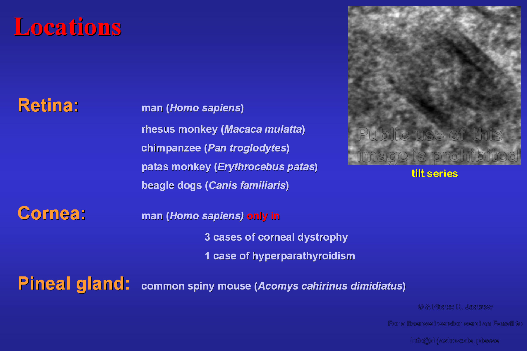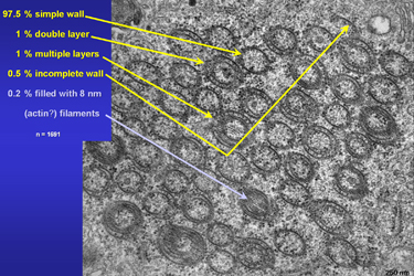 Though retinas of many species were investigated only very few species showed Macrotubuli aggregati (Fig.22). There are only two other locations where they were also encountered so far: 4 cases of pathological human cornea and one species where the organelles were present in the pineal gland. The animation shows a detail of tilting of a thick section with Macrotubuli aggregati possessing a double layered wall. |