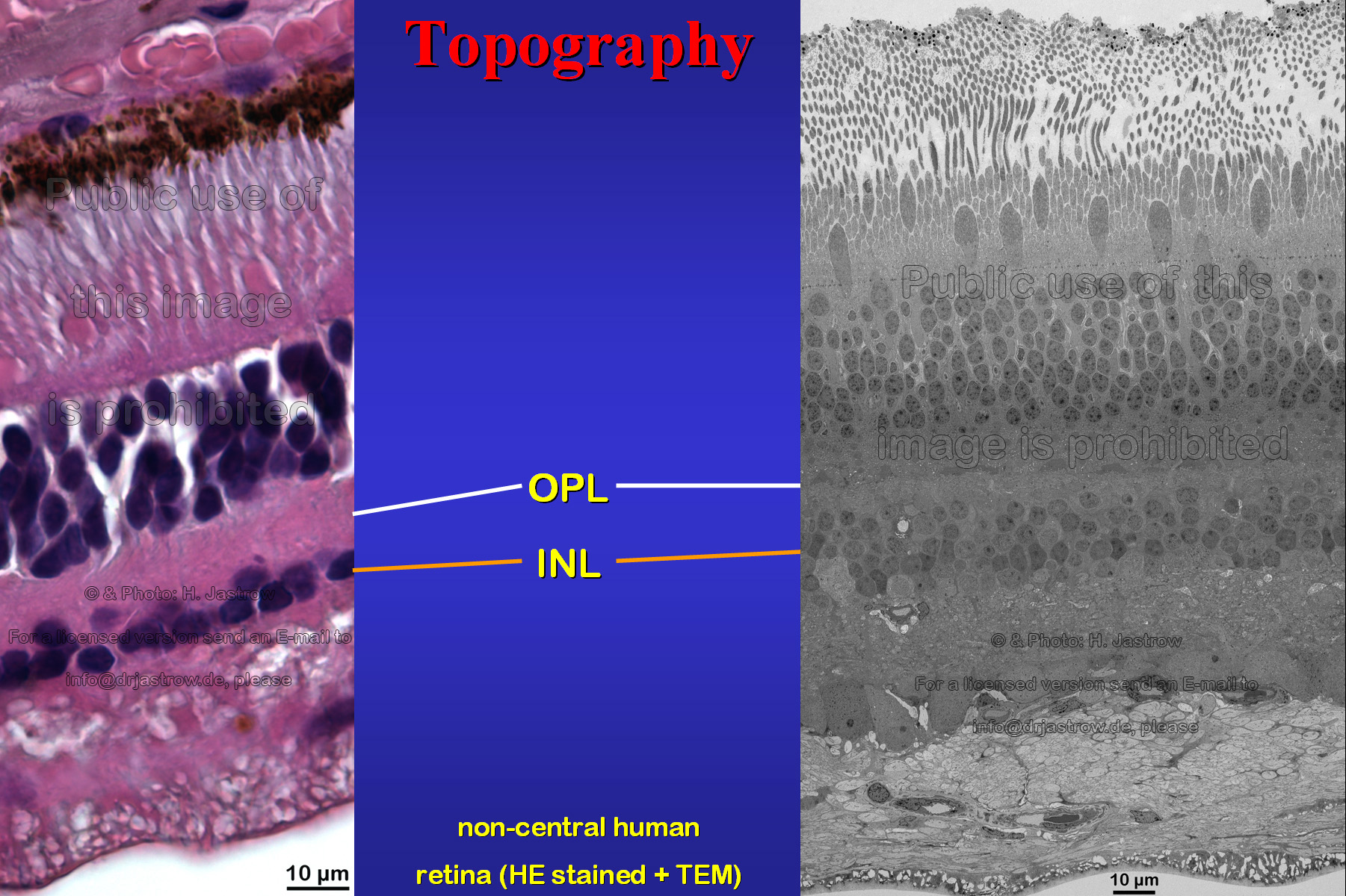 | Fig.1 | The retina is the most important sensory area in mankind. Its general structure and organization is well known today. However, human retina also contains strange, large cell organelles which are still unfamiliar to most of us and lack a meaningful name in terminology. They were first noted by Dogiel in 1884 but mistaken as artefacts. In 1918, Kolmer was the first investigator who realised that darkly stained stripes he noted in human horizontal cell cytoplasm must be something special. He discovered strange elongate basophilic areas in the upper inner nuclear layer (Fig.2, INL) of the human retina which were lacking in almost any other species. | Fig.2
