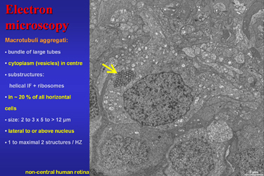 Fig.6 demonstrates a typical horizontal cell, the only location in the retina where the cell organelles appear. Here we see them cross-sectioned in the cytoplasm. We decided to call them Macrotubuli aggregati since they are large cytoplasm-filled tubes. As we will see soon their walls consist of intermediate filaments to which ribosomes are attached. |