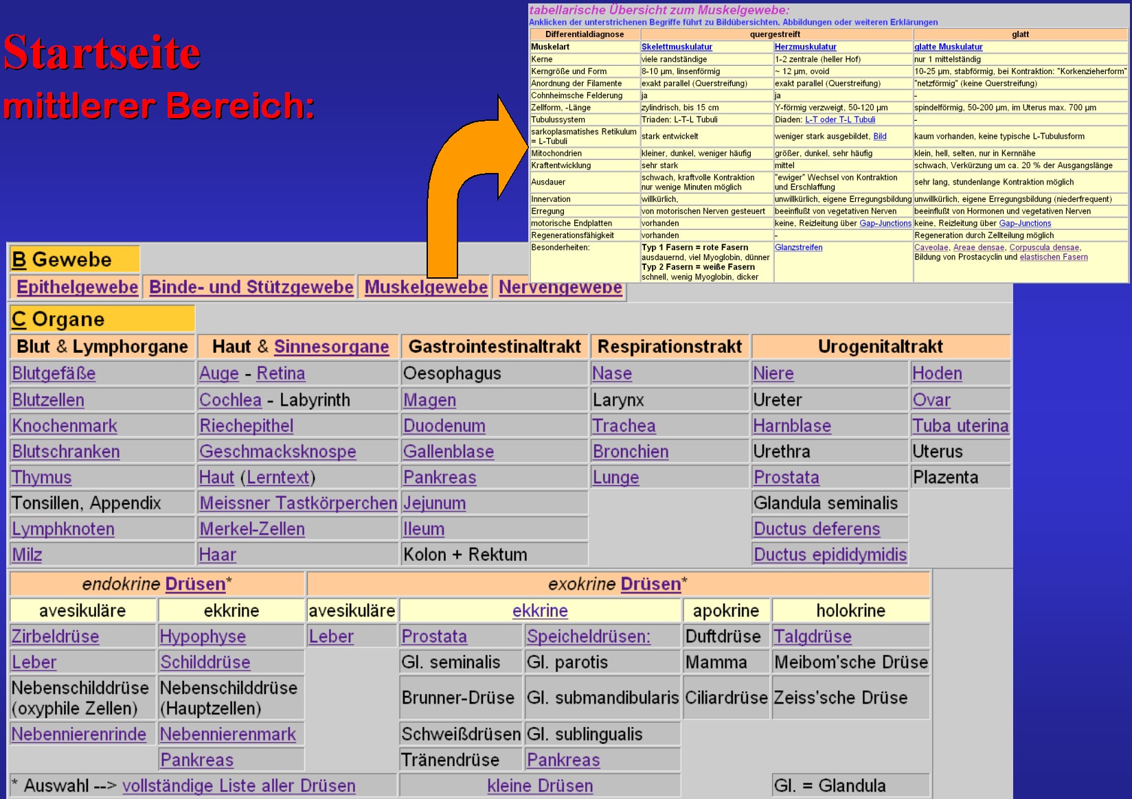 | In Abb.9 sehen Sie die Startseite des Atlasses, die gegliederte Tabellen zu verschiedenen Themen zeigt. Dabei sind die unterstrichenen Begriffe mit entsprechenden Übersichtsseiten verknüpft. Die Tabelle des oberen Bereiches zeigt alle Bestandteile von Zellen und extrazelluläre Strukturen auf. Klickt man hier z.B. auf den Begriff Aktinfilamente, so wird die rechts oben gezeigt Informationsseite aufgerufen. Abb.10 zeigt den mittleren Bereich der Startseite. Hier gelangt man zu tabellarischen Übersichtsseiten der 4 Grundgewebsarten, hier am Beispiel des Muskelgewebes gezeigt, und zu Bildübersichten von Organen und Organsystemen. | ![]() |